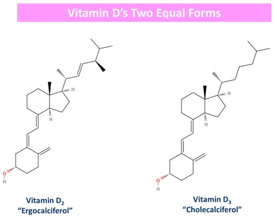 Generally, vitamin D is predominantly produced when the surface of the skin is exposed to plain sunlight. However, it is also obtained from food sources and dietary supplements, while its production is suppressed by the use of sunscreen emulsions and clothing [29,30]. Vitamin D has two equal forms: D3 (“cholecalciferol”) and D2 (“ergocalciferol”). The difference between these two derivatives lies in their side chain [30,77]. Essentially, vitamin D2 has one more double bond in its molecule (C22–23) than its counterpart vitamin D3 [77]. Moreover, vitamin D3 is synthesized de novo in our skin after UV-B radiation exposure or it is obtained from animal source foods, and at the same time, vitamin D2 is acquired from plants like mushrooms and yeast [79,84]. The 2D form of these two vitamin D derivatives is depicted in Figure 3.