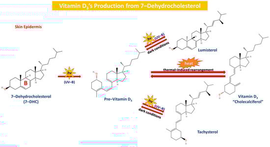 Vitamin D’s metabolism is at first initiated by a cholesterol precursor molecule known as 7-DHC, which is located in the skin. As aforementioned, Windaus et al. proposed and determined the pathway of 7-DHC’s conversion to vitamin D3. As long as our skin is exposed to sunlight, the precursor molecule is converted into pre-vitamin D3, which is then converted by heat into vitamin D3. This specific reaction is induced in the epidermis (skin), where sunlight (UV-B form, hv) successfully breaks the B ring of 7-DHC with a view to form pre-vitamin D3, which is in turn converted to vitamin D3 after undergoing a thermal-induced rearrangement. Furthermore, the prolonged irradiation of pre-vitamin D3 concludes to the reversible formation of two more vitamin D3 derivatives, namely tachysterol and lumisterol, that are able to be reverted back to pre-vitamin D3 in dark conditions [31,77,79]. Vitamin D3 later on enters the bloodstream and is transported to the liver after binding to vitamin D’s specific binding protein (Figure 4).