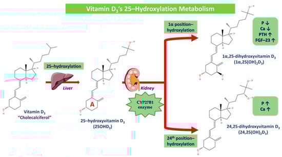 Vitamin D3’s 25-hydroxylation metabolism. 25-hydroxylation occurs in the liver, where vitamin D3 is converted to 25-hydroxyvitamin D3 (25OHD3), which is then converted in the kidney via the cytochrome CYP27B1 enzyme in two different derivatives. Via the hydroxylation in the 1α (A ring) position, 25OHD3 is converted to 1α,25-dihydroxyvitamin D3 (P and Ca are decreased while PTH and FGF-23 are increased) and via the hydroxylation in the 24th position, 25OHD3 is converted to 24,25-dihydroxyvitamin D3 (P and Ca are increased).