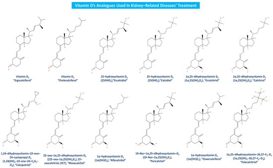 Vitamin D analogues like calcipotriol (1α,24(OH)2-22-ene-24-C3H5-D3) have been recently claimed to manage more effectively uremic pruritus and have been used as adjunctive CKD-associated pruritus (CKD-ap) and ESRD treatment [96,97]. Clinical studies have firmly established alfacalcidol’s (1α(OH)D3) beneficial effects on CKD, bone disease and secondary hyperparathyroidism [98,99]. Doxercalciferol (1α(OH)D2) is a highly effective vitamin D analogue as well, as it suppresses secondary hyperparathyroidism in CKD patients at stage 4 [100], and PTH levels in patients suffering from CKD stages 3 and 4 [101]. Falecalcitriol has also been suggested to be a potent inhibitor of PTH, and in fact, it has been proved to be more effective than alfacalcidol in reducing PTH with similar rates of hypercalcemia, almost as calcitriol’s corresponding impact [102]. As apparent, there are several beneficial effects of vitamin D analogues toward kidney-related diseases, but in order for a more sustained utilization of the related treatment to be promoted, further and newer clinical trials must be conducted worldwide. Vitamin D and its most widely used analogues in kidney-associated diseases treatment are depicted in Figure 6.