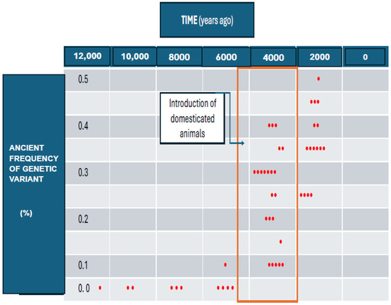 The earliest detection of HLA-DRB1*15:01 was obtained from ancient Balkan DNA from the Varna and Smyadovo sites, estimated to be ~6000–5000 years old [20]. Studies have shown this HLA was a sporadic occurrence until the introduction to Europe of domestic animals and herding by pastoralists between 5000 and 2500 BCE [15,21]. The frequency of this genetic variant identified in the genomes of ancient individuals, sampled from across Europe, increased notoriously after domestication and herding had evolved as a new human activity. (Figure 2).