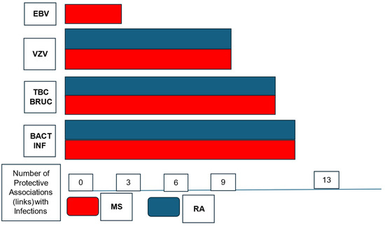HLA-DRB1*15:01 modulates immune responses to peptides (antigens) presented to lymphocyte T-cell lymphocytes by a peripheral vigilant, macrophage, or neuritic cell. The cascade of the innate immune system reaction protecting against infection is initiated. Novel infections affecting humans previously naïve to such appeared among the pastoralists due to contagions from the animals they herded (zoonotic diseases) and once they had become an intimate part of the household. The outstanding and sophisticated study by Barrie et al. [21], published in 2024, addresses several significant aspects related to these ancient occurrences and how they impacted the origin of MS in Europe (and the world). HLA-DRB1*15:01 was produced by the human immune system as a protector against the new infections appearing due to animal domestication. The infections appearing in the new scenario, as expected, were predominantly bacterial (abscesses, ulcers, infected wounds), mycosis, tuberculosis, brucellosis, and viral with a larger manifestation of varicella-zoster species, more than Epstein-Barr virus (EBV), considering this is the modern main concern as infectious contributor to MS. This finding suggests EBV probably became a contributing element in later millennia (Figure 3). Rheumatoid Arthritis, another autoimmune mediated disease, apparently has similar ancestral DNA molecular roots to MS.