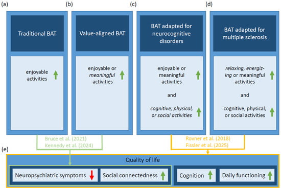 Overview of the historical development of behavioral activation therapies (BATs), their respective activity aims, and their evidence-based effects. (a,b,e) Traditional BAT and value-aligned BAT aim to increase enjoyable or enjoyable and meaningful activities, respectively, thus reducing different neuropsychiatric symptoms (e.g., depression, anxiety, and substance use) and increasing social connectedness [,,,,]. (c–e) BAT adapted for neurocognitive disorders (i.e., mild cognitive impairment and mild dementia) additionally aims to increase activities with cognitive, physical, or social demands improving cognition, daily functioning, and quality of life [,,,]. For MS-adapted BAT, we suggest that enjoyable activities should be categorized in energizing and relaxing enjoyable activities based on their level of arousal (high vs. low, respectively). It should focus especially strongly on adapting relaxing vs. stressful activities, and it should not primarily focus on activation but similarly on both increasing beneficial activities (e.g., relaxing activities) and decreasing detrimental activities (e.g., decreasing stressful activities). We propose that MS-adapted BAT improves the four domains of quality of life. Green arrows up indicate increases. Red arrows down indicate reductions. Italics are used to emphasize changes in the development of BAT.