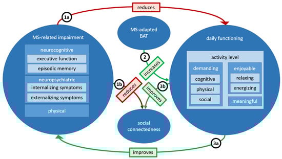 Mechanistic model of MS-adapted behavioral activation therapy. We assume that MS-related impairment reduces social connectedness and daily functioning, including the level of demanding, relaxing, energizing, and meaningful activities (see number 1a and 1b). MS-adapted BAT aims to increase the level of activities with these characteristics (see number 2). Changes in activity levels, in turn, are assumed to improve social connectedness and MS-related impairment through altering immune, neuroinflammatory, mitochondrial, and neuroplastic processes (see number 3a and 3b).