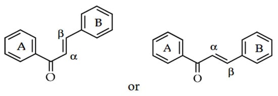 Chalcones are classified within the flavonoid group of phenolic compounds [6]. As open-chain flavonoids, they are derivatives of 1,3-diphenyl-2-propen-1-ones and consist of two aromatic rings connected by an α,β-unsaturated carbonyl system (Figure 1). Due to the double bond in this system, chalcones can exist in two stereoisomeric forms: the trans (E)-isomer, which is the most stable and commonly found in nature, and the less stable cis (Z)-isomer. Both configurations share the same core structural features but differ in the relative orientation of the substituents around the C=C bond [1]. They are based on two aryl units bridged by an α,β-unsaturated carbonyl group [10] and are not only important precursors for synthetic manipulations, but also constitute an important component of natural products [11]. The chalcones in their aromatic rings have a delocalized p-electron order [10]. Specifically, their biological activities are believed to be attributed to the presence of this double (π) bond, in conjunction with the carbonyl property, as the removal of the carbonyl makes them inactive substances [11].