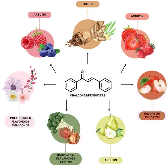 The most prevalent chalcones in food include glucoside, phlorizin (floretin 2’-O-glucose), naringenin (a flavonoid), and arbutin (Figure 2). Flavone and phlorizin are typically associated with apples, while naringenin is characteristic of tomatoes. Arbutin is notably present in pears, and is also found in strawberries, bearberry, wheat and wheat products, as well as in trace amounts in tea, coffee, red wine, and broccoli [13]. Prominent examples of chalcones also include butein. These compounds are widely distributed in strawberries, various berries, certain wheat products, tomatoes, pears, apples, citrus fruits, and hops (Humulus lupulus) [14].