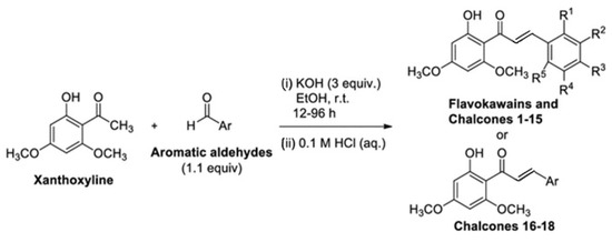 Claisen–Schmidt condensation of xanthoxyline with aromatic aldehydes to synthesize flavokawains and chalcones, reproduced from [26].