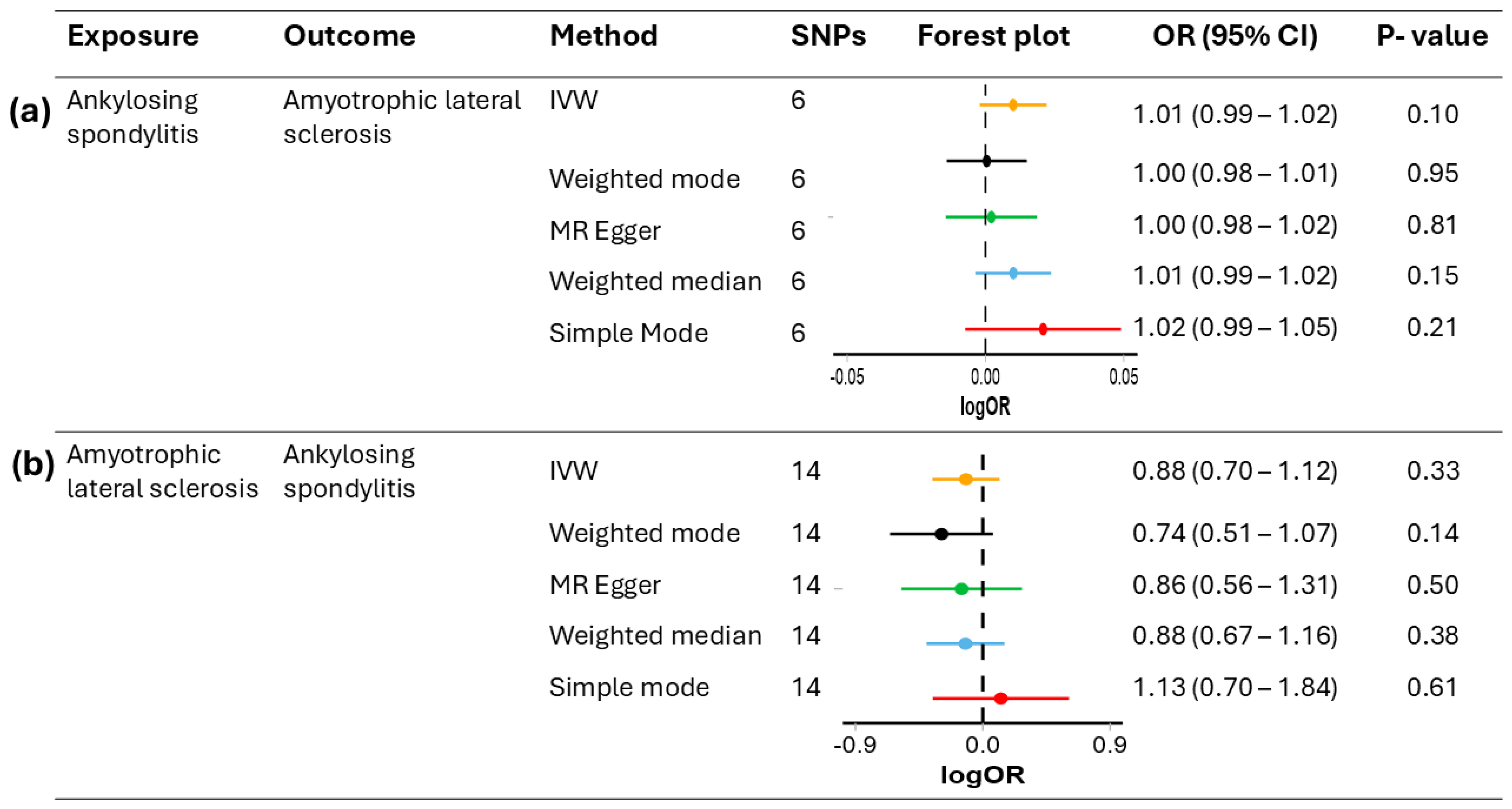 APA StyleAkinade, A. T., Jacobs, E. D., Obere, C. M., Ogaji, V. O., Alakunle, E., & Awe, O. I. (2025). Exploring the Links Between Ankylosing Spondylitis and Amyotrophic Lateral Sclerosis: A Bidirectional Mendelian Randomization Study. Sclerosis, 3(4), 37. https://doi.org/10.3390/sclerosis3040037