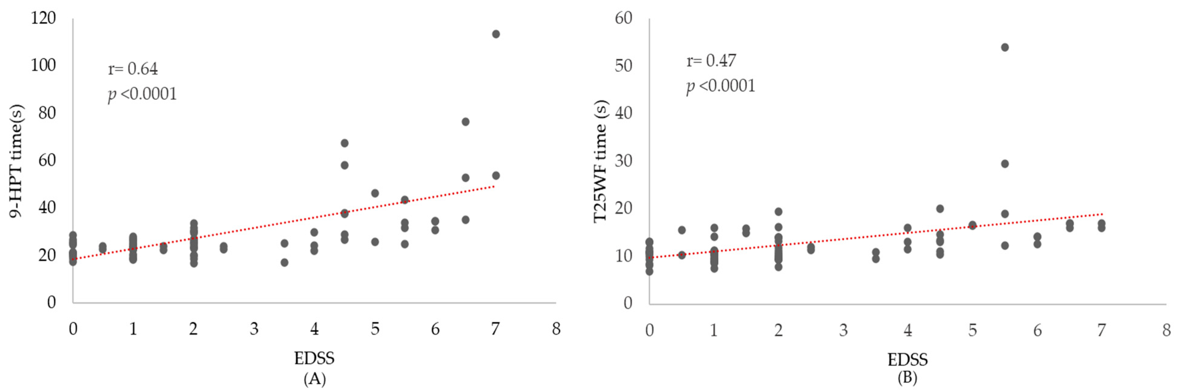 11. Motl, R.W.; Cohen, J.A.; Benedict, R.H.B.; Phillips, G.; LaRocca, N.; Hudson, L.D.; Rudick, R.; Multiple Sclerosis Outcome Assessments Consortium. Validity of the Timed 25-Foot Walk as an ambulatory performance outcome measure for multiple sclerosis. Mult. Scler. J. 2017, 23, 704–710. [Google Scholar] [CrossRef]