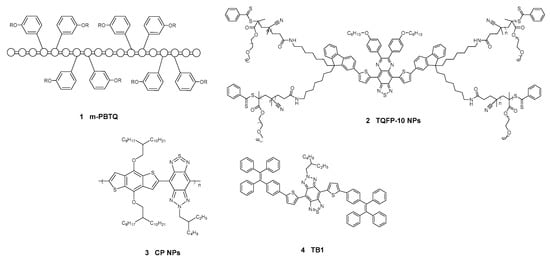 Second near-infrared region (NIR-II) imaging has the advantages of high spatial and temporal resolution, high sensitivity, less background interference, and so on [,]. It also has great advantages in the imaging diagnosis of brain tumors. Therefore, there is a lot of excellent work in NIR-II. Wu and co-workers developed a fluorination strategy for the development of highly fluorescent polymers (Figure 1, 1) in NIR-II []. By using benzodithiophene (BDT) and triazole[4,5g]-quinoxaline (TQ) derivatives as donors and acceptors, they created two sets of fluorine-substituted semiconductor polymers. 1 exhibited bright fluorescence. Through skull and scalp imaging of the cerebrovascular system of live mice, they quantitatively analyzed the vascular morphology of the transgenic brain tumors, such as vascular length, vascular branching, and vascular symmetry. This strategy is critical for designing NIR-II fluorophores with greater fluorescence and provides an important tool for reliable brain tumor diagnosis.