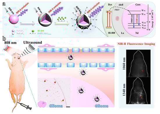 (a) Schematic illustration of the synthesis of water-soluble dye−sensitized core−shell NaNdF4@NaLuF4/IR-808@DSPE-PEG5000 NPs and their energy transfer mechanism. (b) Application of the core−shell NaNdF4@NaLuF4/IR−808@DSPE-PEG5000 NPs in NIR-II fluorescence imaging of orthotopic glioblastoma under ultrasound-mediated opening of the BBB, and rare−earth staining of brain tissue after delivery into the brain [].