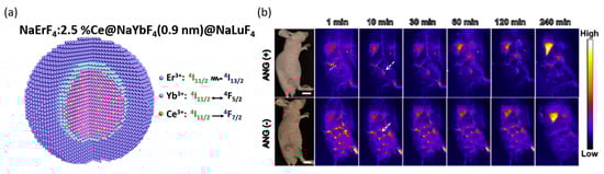 Li et al. reported an energy-cascaded strategy for enhancing the NIR II emission of Er-based core–shell-shell down-conversion nanoparticles (DCNPs), which are used for targeted imaging and image-guided surgery for orthotopic gliomas []. They modified the optimal DCNPs with dye-brush polymer (Dye-BP) to facilitate 4I13/2→4I15/2 transition. Then, they modified nanoparticles with tumor-targeting angiopep-2 peptide (ANG), which can specifically bind to overexpressed low-density lipoprotein receptor-related protein (LRP) on glioma cells (Figure 3). Fluorescence emission of DCNPs in aqueous solution at 1525 nm was increased 675-fold. Moreover, DCNPs exhibit potent fluorescence emission and profound tissue penetration. Altogether, DCNPs exert tremendous potential for imaging deep tumors and image-guided surgery.