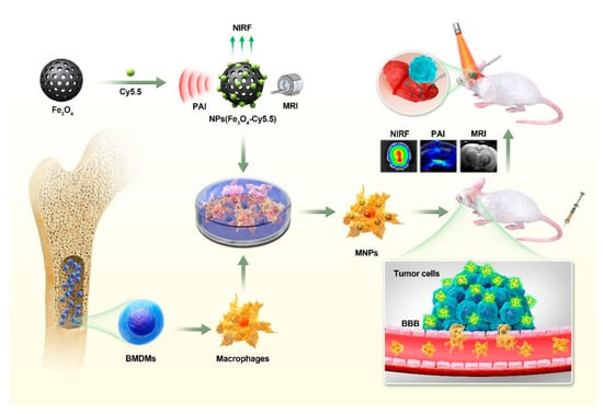 Multifunctional materials have the advantages of performing multiple functions and being more comprehensive. Therefore, numerous efforts were devoted to the development of multifunctional imaging materials. Li and co-workers created a macrophage loaded with a photothermal nano-probe (MFe3O4-Cy5.5) that can conduct magnetic resonance imaging (MRI), fluorescence imaging (FLI), and photoacoustic imaging (PAI) on primary macrophages and target gliomas in mice after injection into the tail vein []. Cy5.5 was conjugated onto the surface of the nanoparticles, which was then taken up by primary macrophages (Figure 4). After injection into the tail vein, MFe3O4-Cy5.5 could cross the blood–brain barrier and reach glioma cells. Multimodal imaging of glioma cells could be used to guide surgical excision, while postoperative tumors could be treated with photothermal therapy. Satisfyingly, MFe3O4-Cy5.5 exhibits distinguished imaging depth, a high signal-to-noise ratio, and an excellent photothermal treatment effect. Altogether, utilizing macrophages containing safe and effective porous magnetic nanoparticles of iron oxide to diagnose and treat gliomas has significant potential applications.