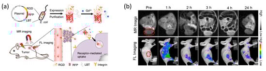 (a) Schematic overview of the biosynthesis of a protein-based molecular imaging probe (RGD-RFP-LBT-Gd) for tumor-targeted FL/MR imaging. (b) MR and FL imaging photos of representative tumor-bearing mice intravenously injected with RGD-RFP-LBT-Gd at different times (0, 1, 2, 3, 4, and 24 h) [].