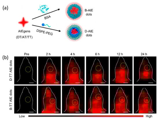 (a) Composition of AIEgens. (b) NIR-II FL imaging of C6 tumor-bearing mice after administration of B-TT AIE dots and D-TT AIE dots at different time points [].