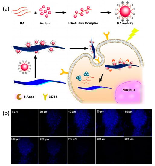 (a) Schematic illustration of the synthetic process of HA−AuNPs and application of the prepared HA−AuNPs/g-CN nanoassembly as an efficient platform for activatable two-photon fluorescence imaging. (b) Depth fluorescence images of the nanoassembly in MDA-MB-231 cancer tissue slices. The change of fluorescence intensity with scan depth was determined by spectral confocal multiphoton microscopy in the z-scan mode [].