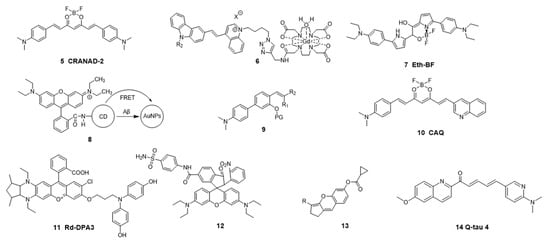 Pan and co-workers designed and synthesized a NIR-II fluorescence probe, Eth-BF (Figure 9, 7), for Aβ oligomers imaging []. 7 consists of N, N-diethylaniline as the recognition group and boron difluoride-bridged azafluvene as the electron-absorbing group. Due to the intramolecular charge transfer (ICT) effect, the fluorescence emission of 7 redshifts to the NIR-II region. Moreover, 7 is sensitive to ambient viscosity, achieving high sensitivity and accuracy of fluorescence switch emission via the AIE process. 7 showed high sensitivity (Kd = 6.16 nM) for the detection of Aβ oligomers. The low molecular weight of 7 facilitates rapid penetration of the blood–brain barrier and imaging of Aβ oligomers in 3-month transgenic AD mouse models. Altogether, 7 is a promising tool for the early diagnosis of AD.