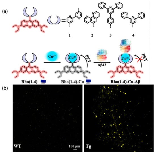 Based on a rhodamine–copper complex, Gong and co-workers developed a fluorescent probe for the detection of Aβ42 to distinguish AD mice from normal mice []. They selected rhodamine as the fluorophore and used four different Cu2+ chelate parts as the recognition unit of Aβ42. The fluorescence of rhodamine was quenched due to the photoinduced electron transfer (PET) effect (Figure 10). When Cu2+ chelates with Aβ42, the PeT effect is interrupted and the fluorescence is restored. The probe showed high sensitivity (detection limit = 24 nM), high affinity (Kd = 23.4 nM), high selectivity, and a fast response speed (within 1 min). Furthermore, utilizing two-photon fluorescence imaging, Rho4-Cu could image Aβ42 in APP/PS1 transgenic mice. These promising results indicated that the probe possesses great potential for the future diagnosis of AD.