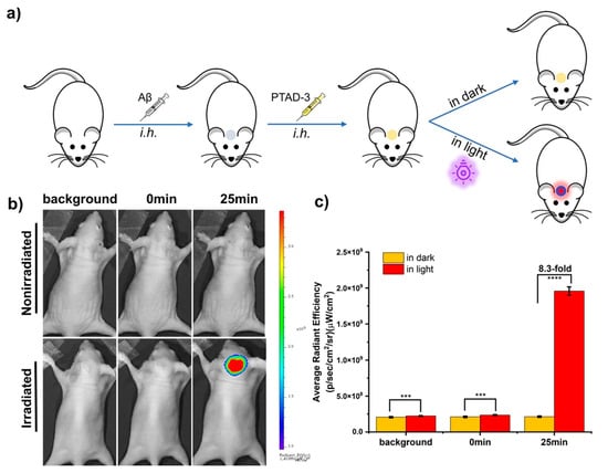 (a) Schematic diagram of Aβ imaging with PTAD-3 in vivo in the simulation model (i.h. means hypodermic injection); (b) In vivo images of nude mice at 25 min after the hypodermic injection of PTAD-3 (2.0 mg/kg−1), which were with or without irradiation under 365 nm UV, n = 3; (c) Quantification of the mean ratio of fluorescence intensity in b. *** p < 0.001, **** p < 0.0001 [].