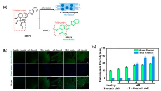 Alzheimer’s disease is a neurodegenerative disease commonly characterized by memory deficits and cognitive decline. The main biomarkers currently used to diagnose the disease are beta-amyloid plaques, phosphorylated tau, and the presence of neurofibrillary tangles []. With the exception of a few familial diseases driven by genetic mutations, the mechanisms of Alzheimer’s disease are not completely understood. Therefore, it is essential to develop effective diagnostic tools and disease-modifying therapies for Alzheimer’s disease. For the diagnosis of Alzheimer’s disease, researchers have conducted extensive work on imaging biomarkers such as amyloid protein (A) and peroxynitrite over the past five years.