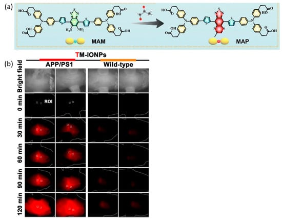 Xu and co-workers reported a biocompatible Fe3O4 nanoparticle (IONP)-conjugated methylglyoxal(MGO)-activatable NIR-II fluorescent probe (MAM) modified with the peptide T7 (HAIYPRH) (TM-IONP) for in situ detection of MGO in transgenic AD mice []. They developed an organic NIR-II fluorescent probe with an MGO-activated response and then attached it to the surface of a biocompatible Fe3O4 nanoparticle to create water-dispersible nanoparticles (IONP). The T7 peptide was utilized to enhance BBB crossing and brain accumulation (Figure 13). TM-IONP has high sensitivity (detection limit = 72 nM) and can detect subtle abnormalities in the level of MGO in the AD brain, allowing it to distinguish AD mice from normal mice. This nanoprobe activated by MGO represents a potential application in the early clinical diagnosis of AD.
