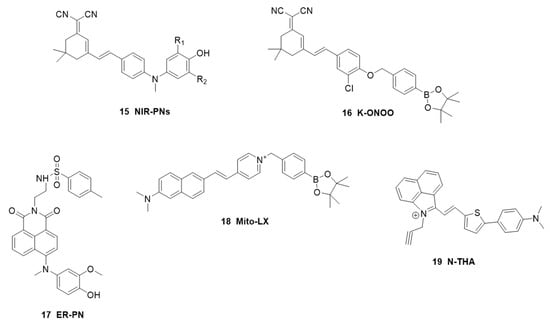 PD is closely related to oxidative stress, and ONOO− can cause cells to enter oxidative stress. Therefore, detection of ONOO− is helpful to explore the pathogenesis of PD []. Liu et al. synthesized a series of NIR probes, NIR-PNs (Figure 14, 15), to detect ONOO− in PD models []. A dicyanoisophorone with a donor (D)−π−acceptor (A) structure was chosen for the fluorophore. The receptors, which were p-aminophenol molecules with substitutions such as 3-hydrogen/methoxy/methyl and 3,5-dimethyl groups, were selected as the ONOO− reactive site. 15 shows a fast response time (within 5 s) and is highly selective for ONOO− detection. 15 has been successfully applied to the imaging of ONOO− content in various PD models, including PC12 cells, drosophila, nematodes, and the mouse brain. This work advances our understanding of ONOO’s biological involvement in Parkinson’s disease.