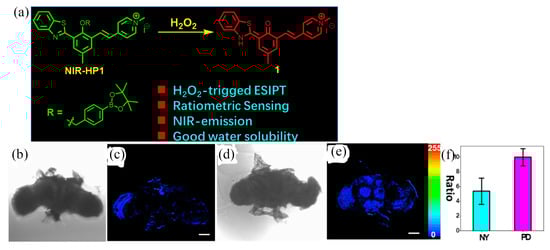 (a) H2O2 sensing mode of NIR-HP1. (b) DIC of a wild-type (WT) Drosophila brain; (c) the ratio of red/green channel for WT; (d) DIC of a Parkinson’s disease (PD) Drosophila brain; (e) the ratio of red/green channel for PD. (f) Ratio intensity profiles of Drosophila brain image panels: NY—wild type (WT) Drosophila brain; PD—Parkinson’s disease (PD) Drosophila brain [].