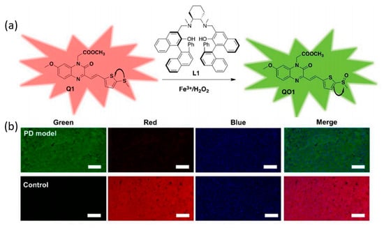 Zhu and colleagues developed a nanoprobe, TAT-Polyp-QL, which can detect accumulated iron and ROS simultaneously in the PD lesion area []. They designed a fluorescent molecule (Q1) containing quinoxalinone fluorophore and aromatic thioether, in which iron combines with a functional iron ligand (L1) to catalyze the formation of sulfoxide from aromatic sulfide, thus changing the fluorescence emission (Figure 16). HIV-1 trans-activating transcriptor (TAT) was introduced to promote the probe’s crossing of the blood–brain barrier. Therefore, the probe achieves dual biomarker detection in the PD model, avoiding the false-positive results caused by traditional single biomarker detection.