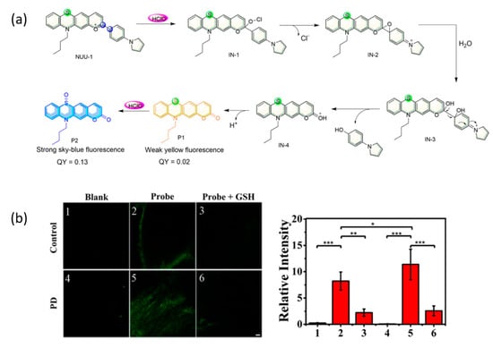 (a) Proposed reaction mechanism of NUU-1 toward HClO. (b) Confocal fluorescence imaging of the probe NUU-1 in the substantia nigra region of the control and PD mouse brains. Brain slices were incubated with NUU-1 and average fluorescence intensities for panels (1–6). *** p < 0.005, ** p < 0.01, * p < 0.05 [].