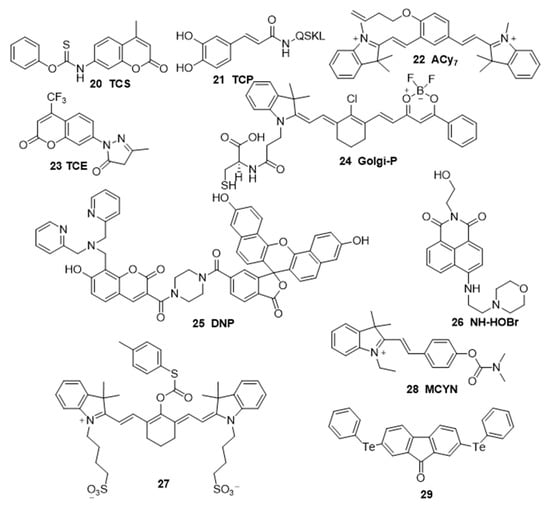 Oxidative stress in the brain is the excessive production of ROS, resulting in the damage of a large number of proteins, nucleic acids, and other biological macromolecules, thus leading to the occurrence and development of depression []. Cysteine (Cys), as a reducing amino acid, can regulate the level of oxidative stress in cells and then affect the occurrence and development of depression []. Our group developed a two-photon fluorescence probe, TCS (20), for detecting Cys in the brains of depressed mice []. In 20, the carbon–sulfur double bond is a key part of identifying Cys. Cys will form a five-membered ring with the carbon–sulfur double bond to restore coumarin’s push and pull electron effect, thus restoring its fluorescence. 20 was able to successfully image Cys in the mouse brain and found that Cys levels decreased with increasing levels of depressive behavior. This work provides a powerful tool for exploring the mechanisms of Cys-mediated-related diseases.