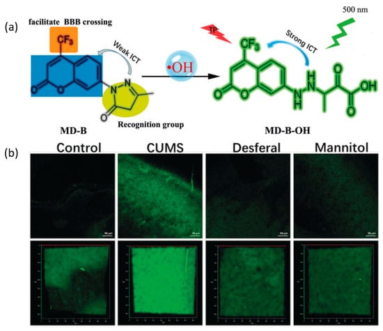 - Wang, X.; Li, P.; Ding, Q.; Wu, C.; Zhang, W.; Tang, B. Illuminating the Function of the Hydroxyl Radical in the Brains of Mice with Depression Phenotypes by Two-Photon Fluorescence Imaging. Angew. Chem. Int. Ed. 2019, 58, 4674–4678. [Google Scholar] [CrossRef] [PubMed]