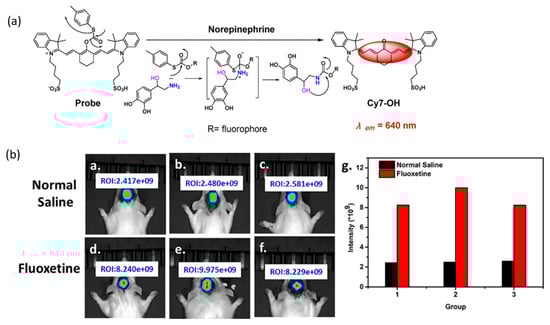 (a) Response mechanism of the probe with norepinephrine. (b): (a–c) In vivo imaging of rats intraperitoneally injected with saline; (d–f) in vivo imaging of rats intraperitoneally injected with fluoxetine. (g) Fluorescent intensity of ROIs in normal saline and fluoxetine-injected rats [].