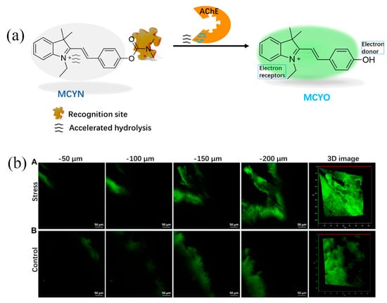 (a) Recognition mechanism of MCYN and structure of MCYO. (b) In situ TP fluorescence imaging in the brains of mice. (A) Stress: mice exposed to 14 consecutive days of chronic−restraint stress. (B) Control: mice not subjected to chronic−restraint stress [].