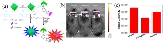 We developed a nano-MOF nanoprobe with Zr(IV) and boric acid as active centers to detect phosphorylation levels []. In vivo imaging and two-photon imaging were used to study the relationship between glycosylation and phosphorylation in depressed mice. Imaging results showed that brain glycosylation and phosphorylation levels were significantly lower in depressed mice than in normal mice (Figure 22). On the one hand, this work provides an effective tool for studying glycosylation and phosphorylation, and on the other hand, it provides a new idea for revealing the pathogenesis of diseases.