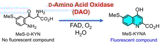 - Sakamoto, T.; Odera, K.; Onozato, M.; Sugasawa, H.; Takahashi, R.; Fujimaki, Y.; Fukushima, T. Direct Fluorescence Evaluation of d-Amino Acid Oxidase Activity Using a Synthetic d-Kynurenine Derivative. Anal. Chem. 2022, 94, 14530–14536. [Google Scholar] [CrossRef]