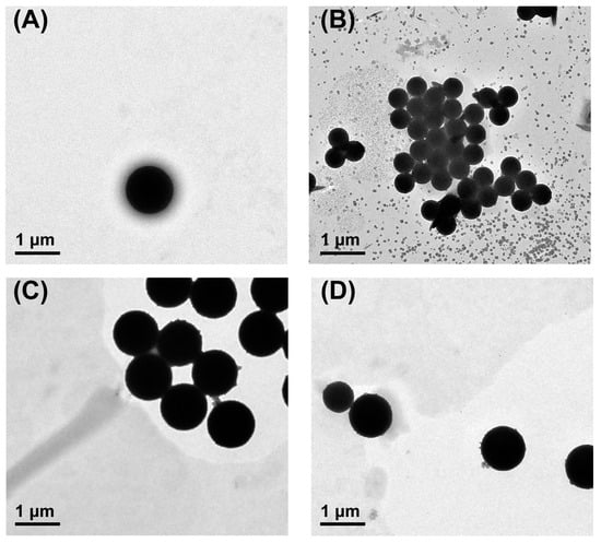 TEM images of (A) HP-MB, (B) SA/P-PS, the magnetically separated product after incubating HP-MB and SA/P-PS with (C) 100 nM miR-27b, and (D) 1 nM miR-27a.