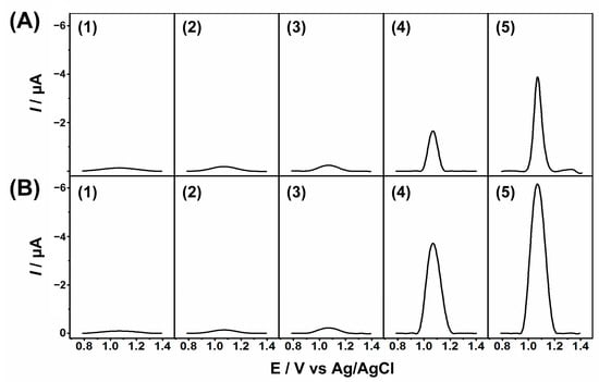 SWVs based on (A) PAP-SIEP and (B) TdT-SIEP for PBS blank (1), 250 fM miR-10a (2), 250 fM miR-27b (3), 120 fM miR-27a (4) and 250 fM miR-27a (5).