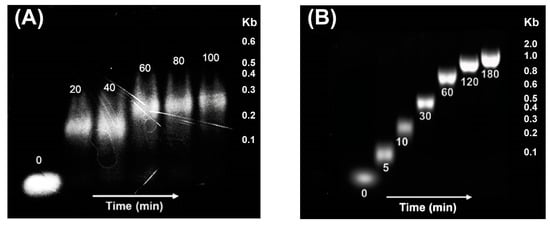 Agarose gel electrophoresis shows the time-dependent growth of (A) RNA catalyzed by PAP and (B) DNA catalyzed by TdT at different times.