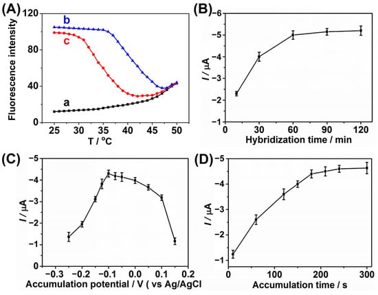 (A) Thermal denaturation profiles of solutions containing FAM-DABCYL labeled molecular beacon in the absence of targets (curve a), 250 fM target miR-27a (curve b), and 250 fM mismatched miR-27b (curve c). Effects of (B) hybridization time, (C) accumulation potential, and (D) accumulation time on the SWV response.