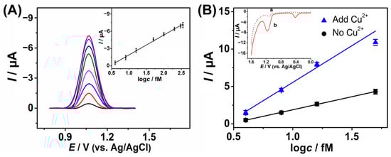 It has been reported that the voltammetric response of free (monomeric) guanine and adenine nucleobases can be further enhanced upon the presence of copper (II) ions due to the accumulation of the copper(II)–purine complex []. The inset of Figure 5B showed the SWV responses at the pencil electrode for 16 fM miR-27a after the TdT-SIEP-based method in the absence/presence of Cu2+. The adsorptive accumulation of free adenine nucleobases resulted in small anodic peak formation at 1.1 V (inserted curve a), while substantial enhancement of the signal at 1.1 V was observed in the presence of Cu2+, forming Cu2+–purine complex at 0.35 V at the same time (inserted curve b). The peak current displayed a 6.6-fold signal enhancement in the presence of Cu2+. As a result, Cu2+ was added in order to increase the sensitivity of the detection method. As depicted in Figure 5B, when 2 mg L−1 Cu2+ was used, the peak current increased greatly with the concentration of miR-27a. The linear range was 4–50 fM with a linear regression equation of I (μA) = −9.81 logc (fM) + 4.26 (R2 = 0.992), and the LOD was down to 120 aM (S/N = 3). The detection performance was comparable to and even better than most reported nanomaterials-based electrochemical assays for miRNA detection (Table 2) [,,,,,] but without sophisticated electrode modifications. The high sensitivity of this method can be attributed to the three amplification strategies, including magnetic enrichment, enzymatic polymerization, and the use of Cu2+ ions in SWV.