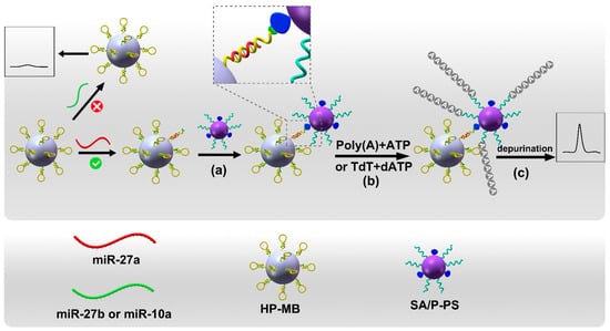 Free purine nucleobase, being electroactive, unlike DNA and RNA, could be directly detected using the electrochemical method, thereby achieving label-free detection []. By carrying out in situ polymerization of primer on vectors, e.g., polystyrene sphere (PS), followed by depurination, it is possible to achieve greater signal amplification. Here, we established an ultrasensitive electrochemical approach coupled with PS, magnetic beads (MBs), and template-free amplification for detecting the target miRNA, miR-27a. A huge amount of hairpin probe (HP) attached to the MBs’ surface provided selectivity to target miR-27a. Oligonucleotide primers, which were loaded on PS, were later tailed by thousands of adenines at their 3′ ends through template-free surface-initiated enzymatic polymerization (SIEP). Hybridization of hairpin probes appears upon the presence of target miR-27a, which is able to capture numerous polystyrene spheres to the surface of a magnetic particle. Followed by SIEP amplification, acidic depurination, and adsorptive chronopotentiometric stripping measurements of the free nucleobases in the presence of copper ions at a disposable pencil graphite electrode, the concentration of miR-27a can be measured. This method achieved an attomole level limit of detection at optimal experimental conditions and was applied to the direct detection of the miRNA concentrations in human serum samples, satisfying the need for rapid and easy methods for early cancer marker detection in clinical diagnostics.