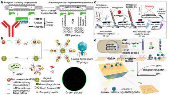 Rapid and sensitive detection of pathogenic viruses is crucial for pandemic control. Hou et al. reported a swift and highly sensitive optical biosensing method for detecting avian influenza virus H9N2 (Figure 6d), utilizing a genetically modified filamentous M13 phage probe, M13@H9N2BP@AuBP, that borne an H9N2-binding peptide (H9N2BP) at its tip and a gold nanoparticle (AuNP)-binding peptide (AuBP) on its sidewall [74]. Simulation modeling demonstrated that the electric field in surface plasmon resonance (SPR) enhanced by 40-fold compared to conventional AuNPs, guaranteeing the experimentally ultrasensitive detection of H9N2 particles with a detection limit down to 6.3 copies/mL. It was even more sensitive than the quantitative polymerase chain reaction (qPCR). Further, after capturing H9N2 viruses on the sensor chip, the H9N2-binding phage nanofibers can be quantitatively converted into visible plaques, allowing for quantification through naked-eye observation. This phage-based biosensing strategy can be easily extended to the detection of other pathogens just by replacing the H9N2-binding peptides with other pathogen-binding peptides using phage display technology.