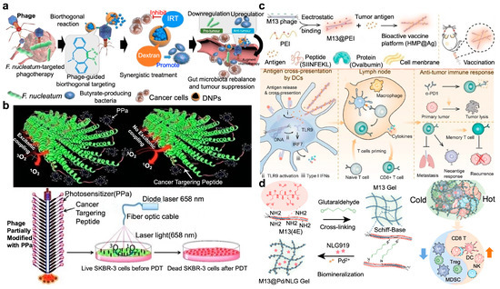 Emerging research highlights the significant role of the microbiota in both the development and progression of various types of cancer (e.g., colorectal cancers (CRCs) that exist in the gut with abundant bacteria). It has been demonstrated that bacteria can induce severe drug resistance in cancer chemotherapy and foster the immunosuppressive tumor microenvironment (TME) that impedes the immune cell responses [92,93]. While antibiotics have been proposed to regulate the microbiota, their broad spectrum of targets and negative impact on immunotherapy limit their efficacy. Alternatively, phages offer a promising approach to rebalance the tumor-immune microenvironment through precise manipulation of the gut microbiota and activation of innate immune cells [94]. In clinical practice, conventional cancer treatment modalities such as surgery, radiotherapy (RT), chemotherapy, endocrinotherapy, and targeted therapy are commonly employed. However, these approaches may induce resistance and severe side effects [95]. The integration of phage technology in cancer therapy presents a promising avenue for identifying tumor-targeting agents, carriers, and potential vaccines. Natural microorganisms containing pathogen-associated molecular patterns (PAMPs) effectively stimulate the host’s innate immune response, surpassing synthetic material-based vaccines in robustness and efficacy [96].