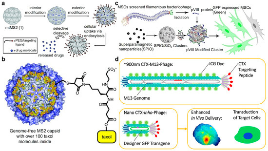 Phage for drug/gene delivery. (a) Construction of multifunctional drug delivery vessels derived from genome-free (mtMS2) phage capsids. Utilizing orthogonal coupling strategies to append over 180 PEG chains to the exterior surface of phage MS2, while decorating its interior surface with 50–70 fluorescein molecules as drug cargo mimic. The loaded drug can be efficiently released after cell uptake [104]. Reproduced with permission from [104]; published by the American Chemical Society, 2007. (b) Drug delivery system with a water-soluble derivative of the chemotherapeutic agent taxol conjugated to the capsids of MS2 phages. An amino acid on the interior of MS2 capsid was mutated to a cysteine residue (N87C) to provide a sulfhydryl group for the attachment of cargo. The modified capsids remained in their native form and released taxol when incubated with MCF-7 cells [105]. Reproduced with permission from [105]; published by the Wiley Online Library, 2009. (c) Phage capsids for gene delivery to mesenchymal stem cells (MSCs). The gene cargo was incorporated into the porous structure of SPIO-embedded magnetic/silica nanoclusters (MSNCs) that was modified with PEI and pVIII proteins extracted from the MSC-targeting phage. Bearing pVIII allowed the nanoclusters to mimic phage particles and target MSCs to achieve gene delivery [106]. Reproduced with permission from [106]; published by the Wiley Online Library, 2013. (d) CTX-M13 phage for gene delivery. After p3 capsid chlorotoxin fusion with the “inho” circular single-stranded DNA (cssDNA) gene packaging system, a miniatured chlorotoxin inho (CTX-inho) phage particle was produced that can target the GBM22 glioblastoma tumors in the brains of mice, achieving enhanced efficiency in gene delivery and target cell transduction [107]. Reproduced with permission from [107]; published by the American Chemical Society, 2022.