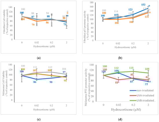 Regarding the effect of hydrocortisone on cell viability and p53 promoter activity in non-irradiated or UV-irradiated fibroblasts and melanoma cells, hydrocortisone significantly and similarly inhibited cell viability and stimulated p53 promoter activity in non-irradiated and UV-irradiated fibroblasts (Figure 1a,b). It did not alter cell viability of non-irradiated or UV-irradiated melanoma cells, but inhibited p53 promoter activity in non-irradiated and UVA-irradiated melanoma cells (Figure 1c,d). Relative to respective controls (100%), hydrocortisone at 2 µM significantly inhibited cell viability and stimulated p53 promoter activity, respectively, to 75% and 153% in non-irradiated fibroblasts; to 80% and 131% in UVA-irradiated fibroblasts; and to 83% and 136% in UVB-irradiated fibroblasts (p < 0.05) (Figure 1a,b). Hydrocortisone at 2 µM significantly inhibited p53 promoter activity in non-irradiated and UVA-irradiated melanoma cells to 77% and 82% of respective controls (100%) (p < 0.05) (Figure 1d).