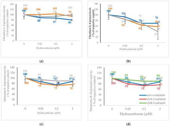 Hydrocortisone significantly inhibited IL-8 promoter activity only in the non-irradiated fibroblasts and IL-8 protein levels in non-irradiated and UV-irradiated fibroblasts (Figure 2a,b). Conversely, hydrocortisone significantly inhibited IL-8 promoter activity in non-irradiated and UV-irradiated melanoma cells and inhibited IL-8 protein levels only in the non-irradiated melanoma cells (Figure 2c,d). Hydrocortisone at 0.02 µM, 0.2 µM, and 2 µM significantly inhibited IL-8 promoter activity to 88%, 87%, and 80% of control (100%), respectively (p < 0.05) (Figure 2a). Relative to respective controls (100%), hydrocortisone at 0.2 µM and 2 µM, respectively, significantly inhibited IL-8 protein levels to 70% in non-irradiated fibroblasts, to 63% and 58% in UVA-irradiated fibroblasts, and to 70% and 39% in UVB-irradiated fibroblasts (p < 0.05) (Figure 2b). Relative to respective controls (100%), hydrocortisone at 0.02 µM, 0.2 µM, and 2 µM, respectively, significantly inhibited IL-8 promoter activity to 86%, 75%, and 87% in non-irradiated melanoma cells; to 79%, 73%, and 76% in UVA-irradiated melanoma cells; and to 94%, 89%, and 90% in UVB-irradiated melanoma cells (p < 0.05) (Figure 2c). Hydrocortisone at 0.02 µM, 0.2 µM, and 2 µM significantly inhibited IL-8 protein levels to 81%, 69%, and 71% of control (100%) in non-irradiated melanoma cells, respectively (100%) (p < 0.05) (Figure 2d).