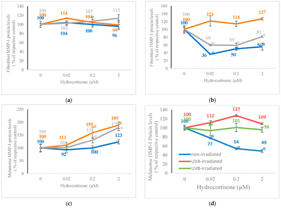 Hydrocortisone did not alter MMP-1 protein levels in non-irradiated or UV-irradiated fibroblasts and inhibited TIMP-1 levels in non-irradiated and UVB-irradiated fibroblasts (Figure 3a,b). It had differential effects in non-irradiated and UV-irradiated melanoma cells: hydrocortisone significantly stimulated MMP-1 protein levels in UVA- and UVB-irradiated melanoma cells but not in non-irradiated melanoma cells, and it significantly inhibited TIMP-1 protein levels in non-irradiated melanoma cells but not in UVA- or UVB-irradiated melanoma cells (Figure 3c,d). Relative to respective controls at 100%, hydrocortisone at 0.02 µM, 0.2 µM, and 2 µM significantly inhibited TIMP-1 protein levels to 36%, 50%, and 56% in non-irradiated fibroblasts, and to 60%, 59%, and 81% in UVB-irradiated fibroblasts (p < 0.05) (Figure 3b). Relative to respective controls (100%), hydrocortisone at 0.2 µM and 2 µM significantly stimulated MMP-1 protein levels to 159% and 189% in UVA-irradiated melanoma cells, and to 131% and 179% in UVB-irradiated melanoma cells, respectively (Figure 3c). Hydrocortisone at 0.02 µM, 0.2 µM, and 2 µM significantly inhibited TIMP-1 protein levels to 77%, 54%, and 49% of control (100%) in non-irradiated melanoma cells, respectively (p < 0.05) (Figure 3d).