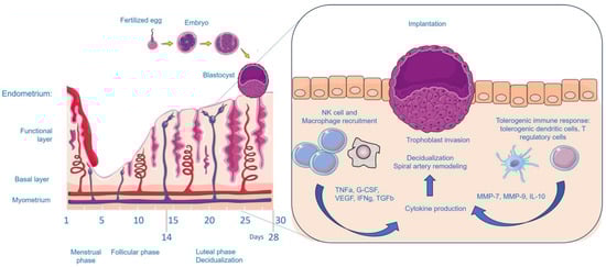 Immune mechanisms in the uterus during zygote implantation. Immunotolerance in the decidua during implantation can be achieved by synchronous and regulated processes, such as selective homing of immune cells to the feto-maternal site, regulated proliferation, and predominant differentiation into a regulatory type of immune cells with the overall goal of the immune responses switching to tolerance, which is a prerequisite for a successful pregnancy. Possibly, dysregulated immune responses and an imbalanced cytokine network may be related to infertility, implantation failures after IVF, and recurrent pregnancy losses. Parts of the figure were drawn by using pictures from Servier Medical Art. Servier Medical Art by Servier is licensed under a Creative Commons BY 4.0 (https://creativecommons.org/licenses/by/4.0/, last accessed on 20 August 2024).