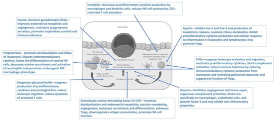 Since the immune mechanisms behind implantation failure, recurrent fetal loss, and overall IVF failure are numerous and include many immune cells, receptors, and cytokines, the treatment options for immunomodulation are also numerous. In Figure 1, we present the immune mechanisms in the decidua following the implantation of a zygote.