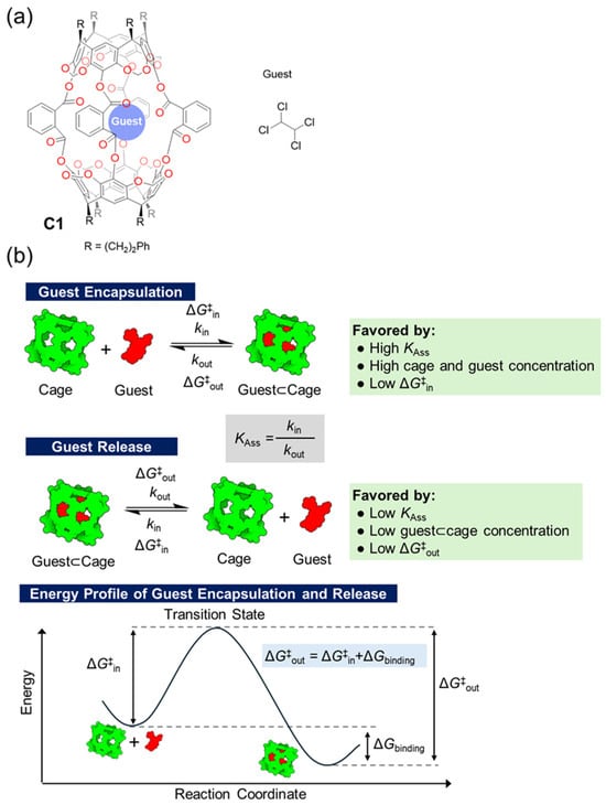 Cram, back in 1991, reported an example of the constrictive binding of a 1,1,2,2-tetrachloroethane guest molecule using a fully organic hemicarcerand host C1 (Figure 1a) [66]. This guest⊂cage complex was stable at room temperature in the solid state or in solution, but was slowly decomplexed by heating it at 100–134 °C. A van’t Hoff analysis provided an activation barrier of 24.6 kcal/mol, with a t1/2 value of 18 h at 100 °C. Further studies by Cram showed that the in–out activation barriers were guest-dependent for a series of hemicarcerands, with the larger guests found to have lower activation energies for decomplexing. This is likely due to the increased compression of the cage to accommodate them, which were released upon decomplexation [67]. The relative size of the guest regarding the size of the portals of the cage was a key parameter for successful constrictive binding. If the guests were too small, constrictive binding was ineffective, as the guest molecules passed through the portals; if the guests were too large, the energy barrier became too high, preventing complexation from occurring [68,69]. Both the guest shape and size influenced the observed constrictive binding [70]. As a result, the in-and-out kinetics of the guest depended on the cage’s conformation and was also correlated with the cage–guest affinity, where stronger affinity led to slower kinetics [71]. The binding properties in these guest⊂cage complexes can be described as the combination of intrinsic binding (i.e., free energy difference between the complex and free cage and guest) and constrictive binding, as the additional free energy barrier was associated with the guest passing through the portals of the cage (Figure 1b) [72]. These systems, in which the guest molecule is trapped inside the cage and is only released from it under specific conditions, act as a gating mechanism [72,73,74,75,76,77,78,79,80].